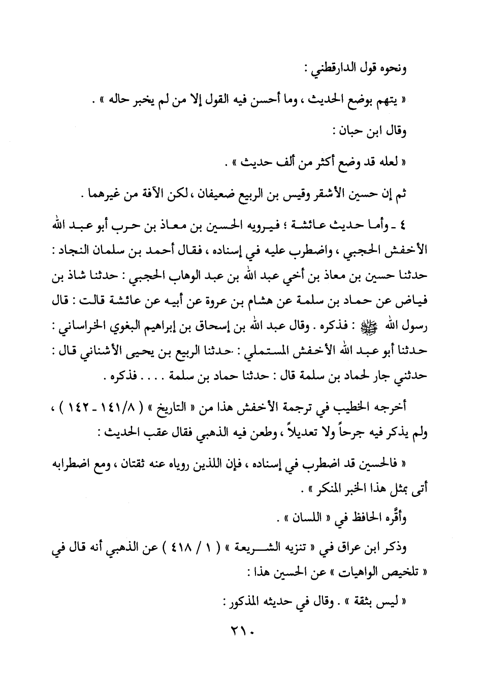 4- وأما حديث عائشة؛ فيرويه الحسين بن معاذ بن حرب أبو عبد الله الأخفش الحجبي، واضطرب عليه في إسناده، فقال أحمد بن سلمان النجاد: حدثنا حسين بن معاذ بن أخي عبد الله بن عبد الوهاب الحجبي: حدثنا شاذ بن فياض عن حماد بن سلمة عن هشام بن عروة عن أبيه عن عائشة قالت: قال رسول الله صلى الله عليه وسلم: فذكره. وقال عبد الله بن إسحاق بن إبراهيم البغوي الخراساني: حدثنا أبو عبد الله الأخفش المستملي: حدثنا الربيع بن يحيى الأشناني قال: حدثني جار لحماد بن سلمة قال: حدثنا حماد بن سلمة ... فذكره.