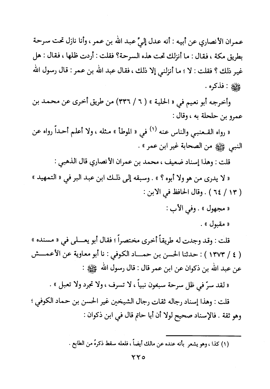 عمران الأنصاري عن أبيه: أنه عدل إلي عبد الله بن عمر، وأنا نازل تحت سرحة بطريق مكة، فقال: ما أنزلك تحت هذه السرحة؟ فقلت: أردت ظلها، فقال: هل غير ذلك؟ فقلت: لا؛ ما أنزلني إلا ذلك، فقال عبد الله بن عمر: قال رسول الله صلى الله عليه وسلم: فذكره.