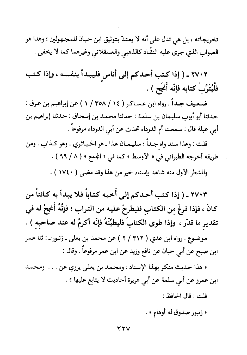 2703 - (إذا كتب أحدكم إلى أخيه كتابا فلا يبدأ به كائنا من كان، فإذا فرغ من الكتاب فليطرح عليه من التراب؛ فإنه أنجح له في تقدير ما قدر، وإذا طوى الكتاب فليطينه فإنه أكرم له عند صاحبه) .