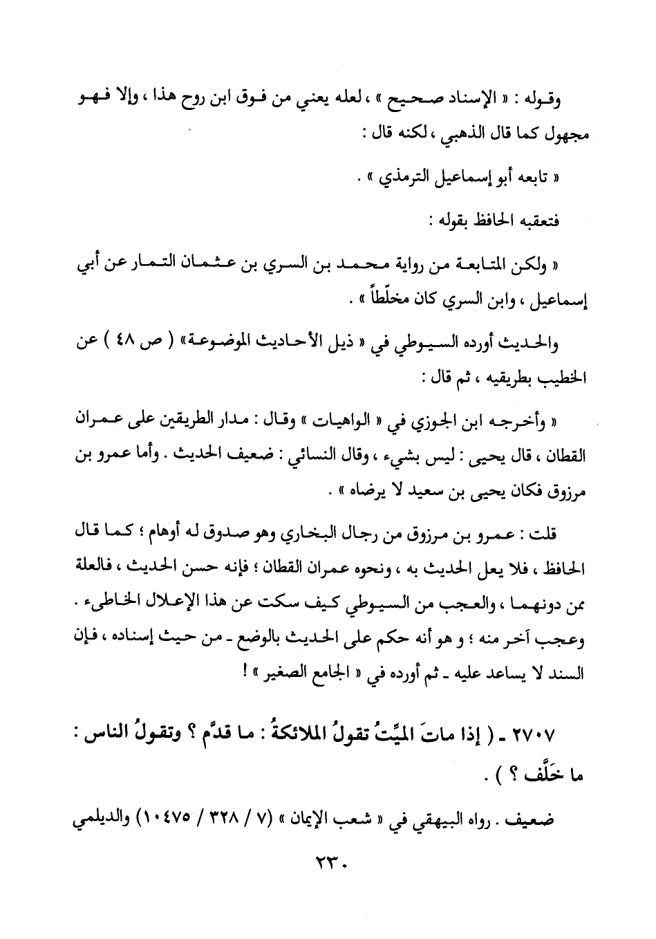 قلت: عمرو بن مرزوق من رجال البخاري وهو صدوق له أوهام؛ كما قال الحافظ، فلا يعل الحديث به، ونحوه عمران القطان؛ فإنه حسن الحدي، فالعلة ممن دونهما، والعجب من السيوطي كيف سكت عن هذا الإعلان الخاطىء. وعجب آخر منه؛ وهو أنه حكم عبى الحديث بالوضع - من حيث إسناده، فإن السند لا يساعد عليه - ثم أورده في " الجامع الصغير "!