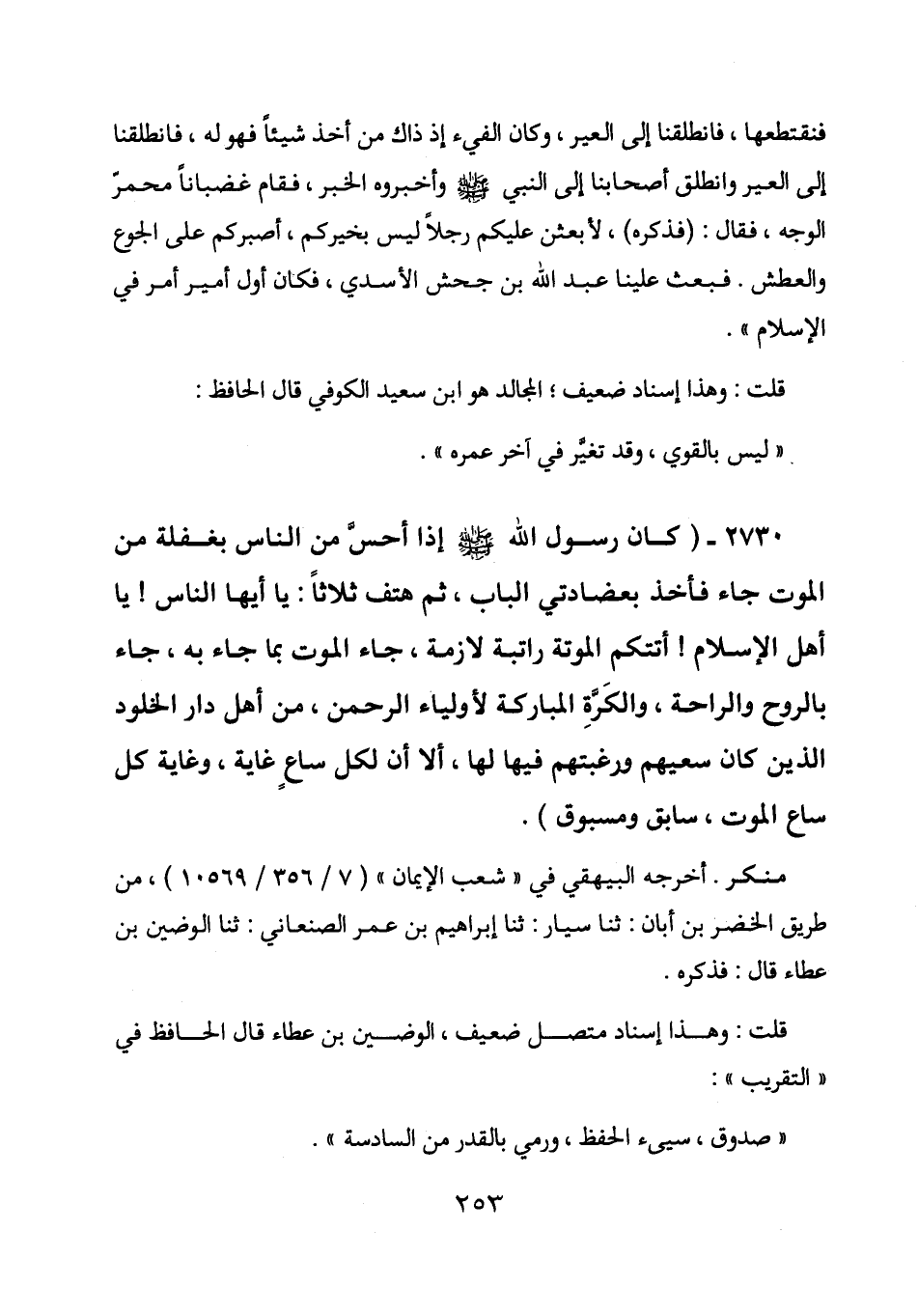 2730 - (كان رسول الله صلى الله عليه وسلم إذا أحس من الناس بغفلة من الموت جاء بعضادتي الباب، ثم هتف ثلاثا: يا أيها الناس! يا أهل الإسلام! أتتكم الموتة راتبة لازمة، جاء الموت بما جاء به، جاء بالروح والراحة، والكرة المباركة لأولياء الرحمن، من أهل دار الخلود الذين كان سعيهم ورغبتم فيها لها، ألا أن لكل ساع غاية، وغاية كل ساع الموت، سابق ومسبوق) .