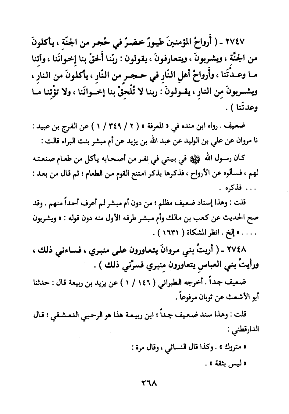 2747 - (أرواح المؤمنين طيور خضر في حجر من الجنة، يأكلون من الجنة، ويشربون، ويتعارفون، يقولون: ربنا ألحق بنا إخواننا، وآتنا ما وعدتنا، وأرواح أهل النار في حجر من النار، يأكلون من النار ويشربون من النار، يقولون: ربنا لا تلحق بنا إخواننا، ولا تؤتنا ما وعدتنا) .