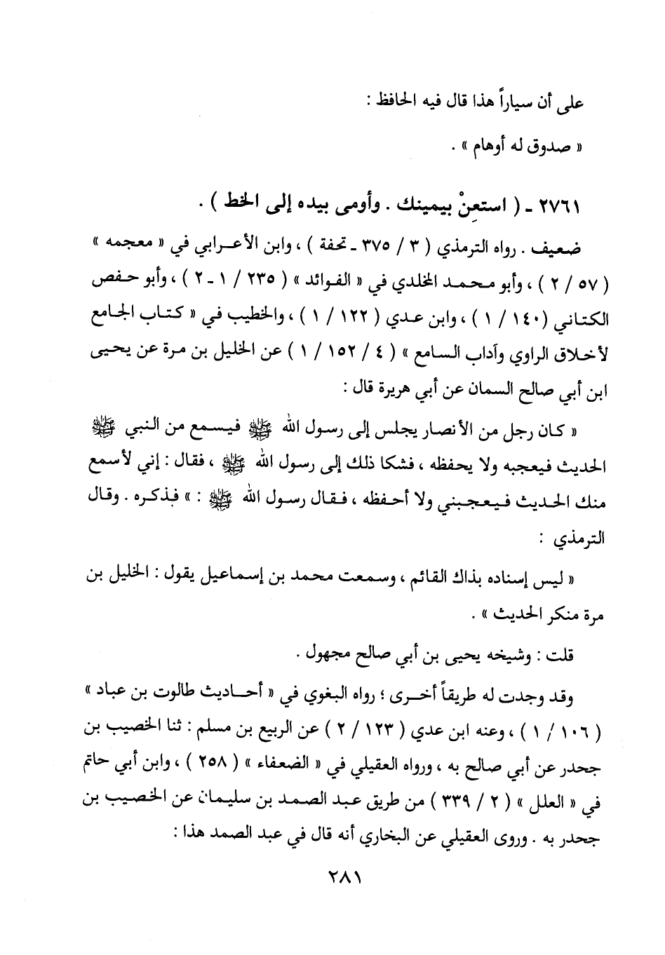 رواه الترمذي (3/375- تحفة) ، وابن الأعرابي في " معجمه " (57/2) ، وأبو محمد المخلدي في " الفوائد " (235/1-2) ، وأبو حفص الكتاني (140/1) ، وابن عدي (122/1) ، والخطيب في " كتاب الجامع لأخلاق الراوي وآداب السامع " (4/152/1) عن الخليل بن مرة عن يحيى ابن أبي صالح السمان عن أبي هريرة قال: