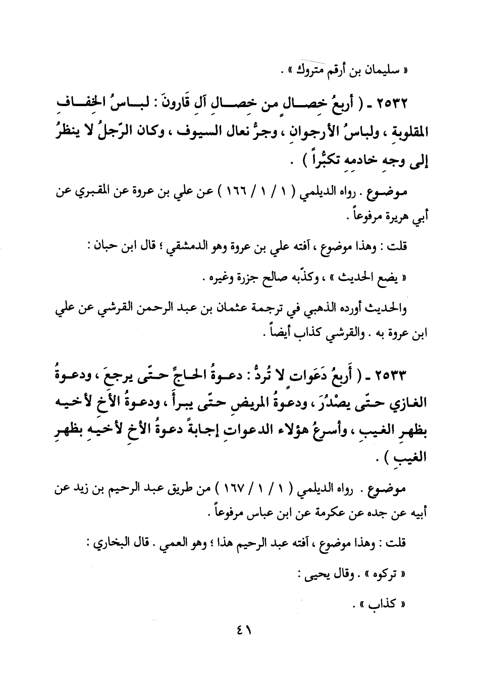 2532 - (أربع خصال من خصال آل قارون: لباس الخفاف المقلوبة، ولباس الأرجوان، وجر نعال السيوف، وكان الرجل لا ينظر إلى وجه خادمه تكبرا) .