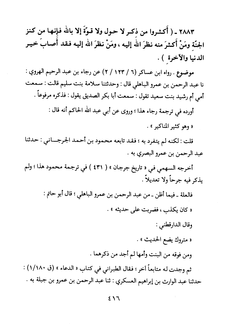 قلت: لكنه لم يتفرد به؛ فقد تابعه محمود بن أحمد الجرجاني: حدثنا عبد الرحمن بن عمرو البصري به.