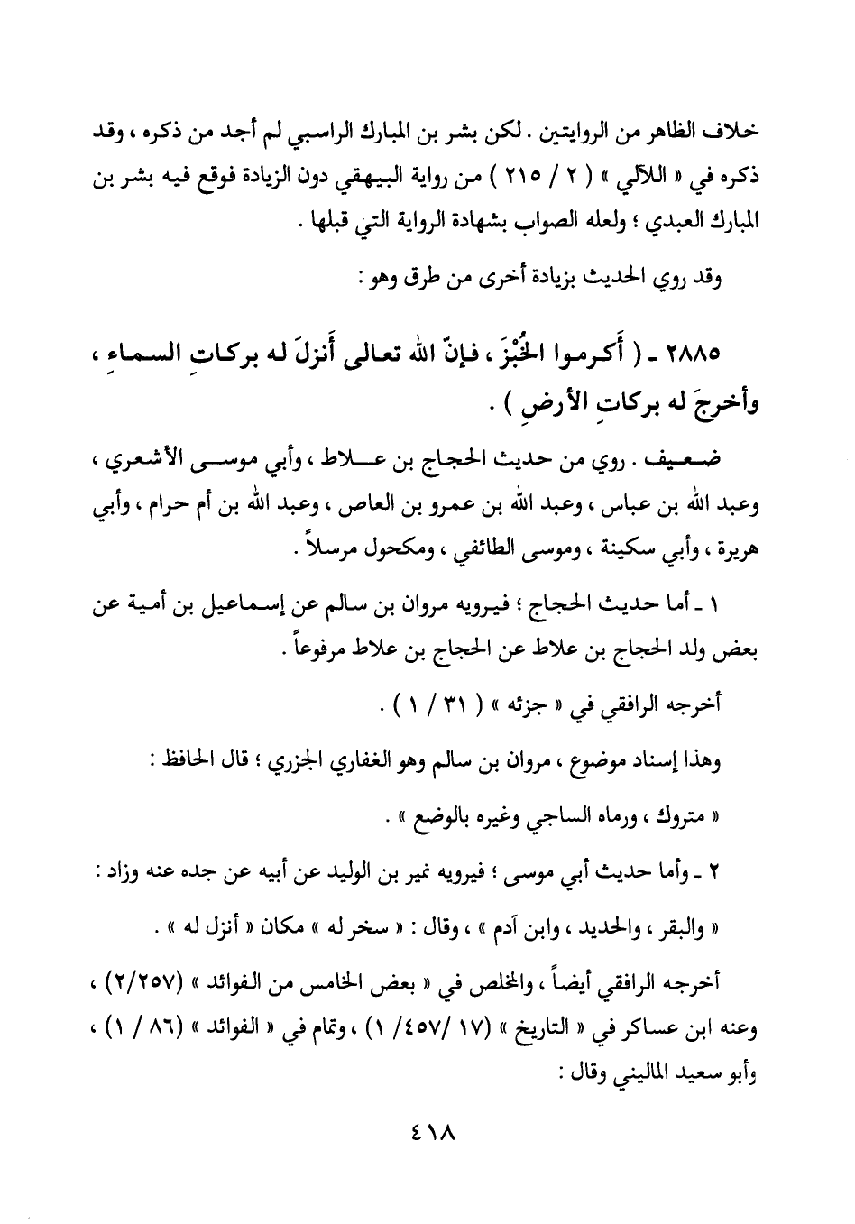 2885 - (أكرموا الخبز، فإن الله تعالى أنزل له بركات السماء، وأخرج له بركات الأرض) .