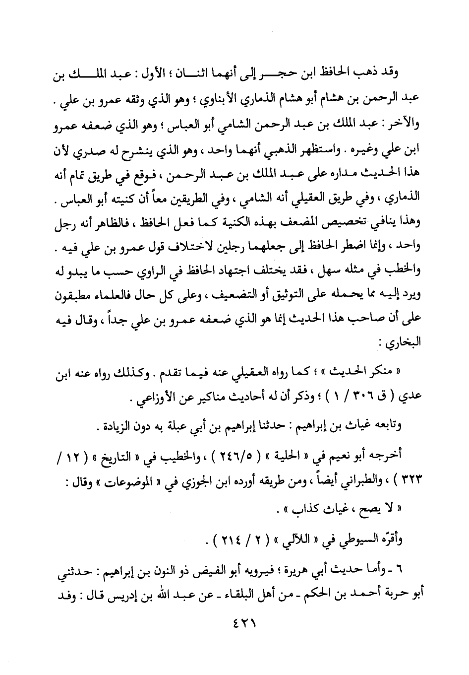 والآخر: عبد الملك بن عبد الرحمن الشامي أبو العباس؛ وهو الذي ضعفه عمرو بن علي وغيره. واستظهر الذهبي أنهما واحد، وهو الذي ينشرح له صدري لأن هذا الحديث مداره على عبد الملك بن عبد الرحمن، فوقع في طريق تمام أنه الذماري، وفي طريق العقيلي أنه الشامي، وفي الطريقين معا أن كنيته أبو العباس. وهذا ينافي تخصيص المضعف بهذه الكنية كما فعل الحافظ، فالظاهر أنه رجل واحد، وإنما اضطر الحافظ إلى جعلهما رجلين لاختلاف قول عمرو بن علي فيه. والخطب في مثله سهل، فقد يختلف اجتهاد الحافظ في الراوي حسب ما يبدو له ويرد إليه مما يحمله على التوثيق أو التضعيف، وعلى كل حال فالعلماء مطبقون على أن صاحب هذا الحديث إنما هو الذي ضعفه عمرو بن علي جدا، وقال فيه البخاري: