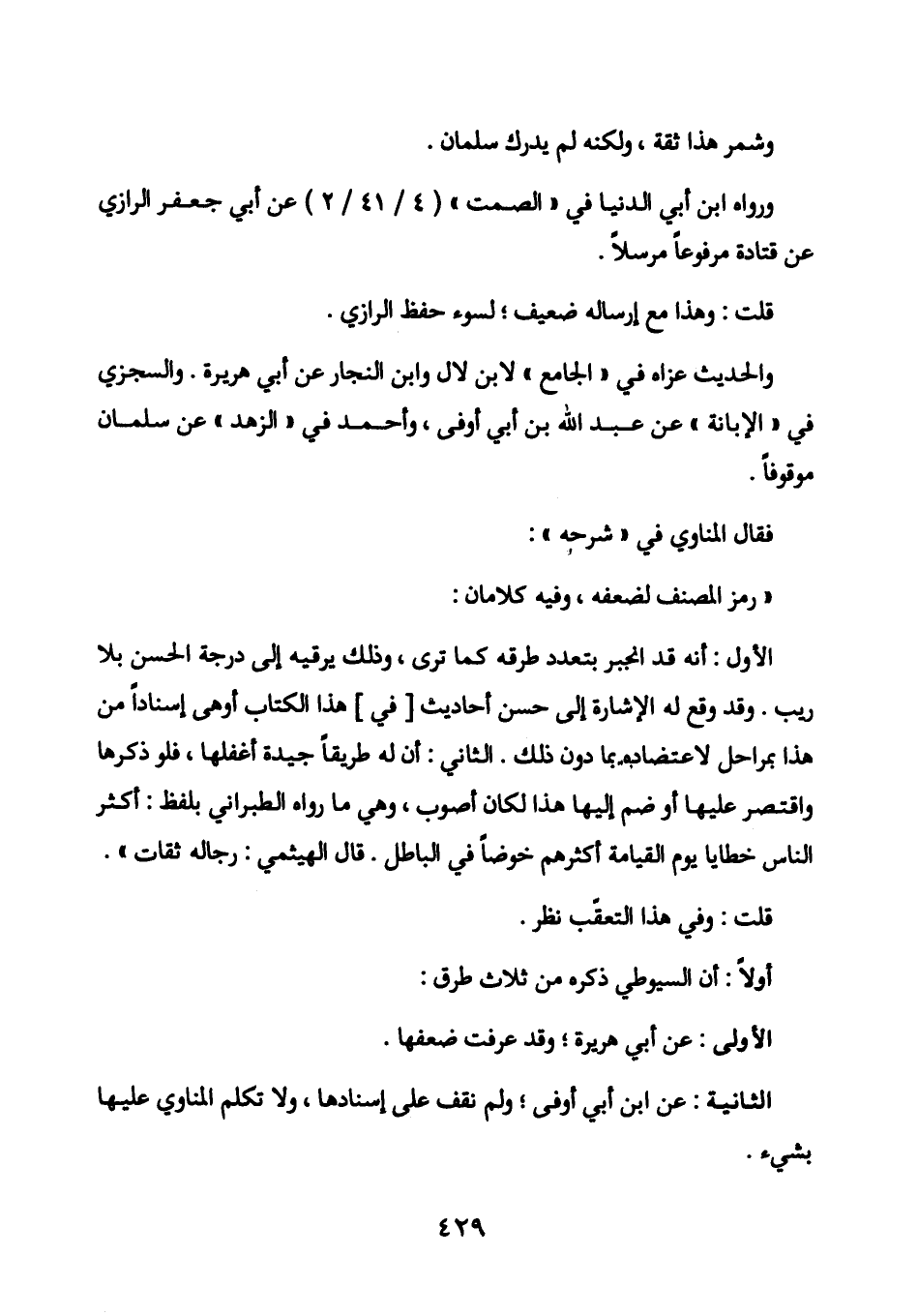 الأول: أنه قد انجبر بتعدد طرقه كما ترى، وذلك يرقيه إلى درجة الحسن بلا ريب. وقد وقع له الإشارة إلى حسن أحاديث [في] هذا الكتاب أوهى إسنادا من هذا بمراحل لاعتضاده بما دون ذلك. الثاني: أن له طريقا جيدة أغفلها، فلو ذكرها واقتصر عليها أو ضم إليها هذا لكان أصوب، وهي ما رواه الطبراني بلفظ: أكثر الناس خطايا يوم القيامة أكثرهم خوضا في الباطل. قال الهيثمي: رجاله ثقات ".