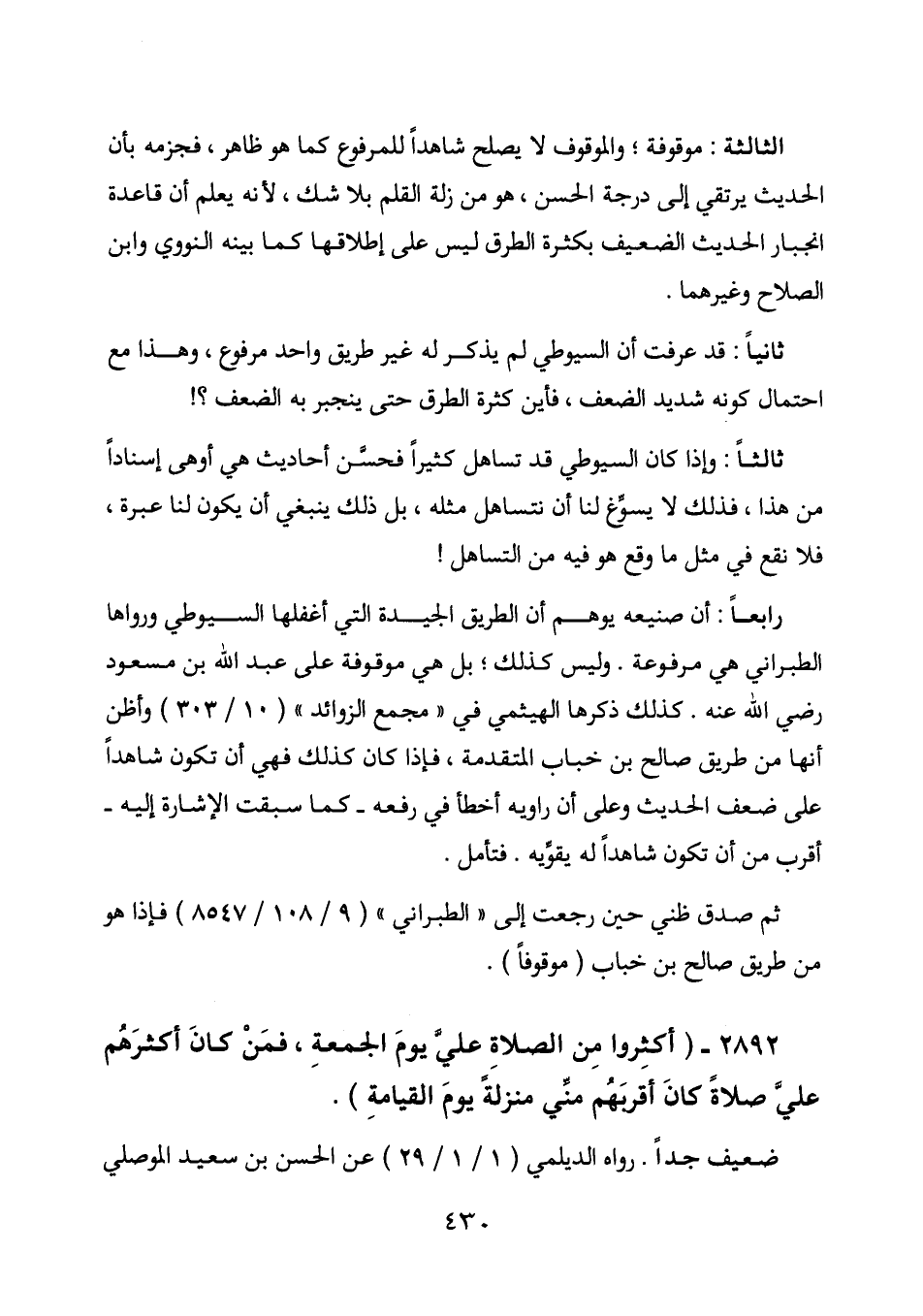 رابعا: أن صنيعه يوهم أن الطريق الجيدة التي أغفلها السيوطي ورواها الطبراني هي مرفوعة. وليس كذلك؛ بل هي موقوفة على عبد الله بن مسعود رضي الله عنه. كذلك ذكرها الهيثمي في " مجمع الزوائد " (10/303) وأظن أنها من طريق صالح بن خباب المتقدمة، فإذا كان كذلك فهي أن تكون شاهدا على ضعف الحديث وعلى أن راويه أخطأ في رفعه - كما سبقت الإشارة إليه - أقرب من أن تكون شاهدا له يقويه. فتأمل.