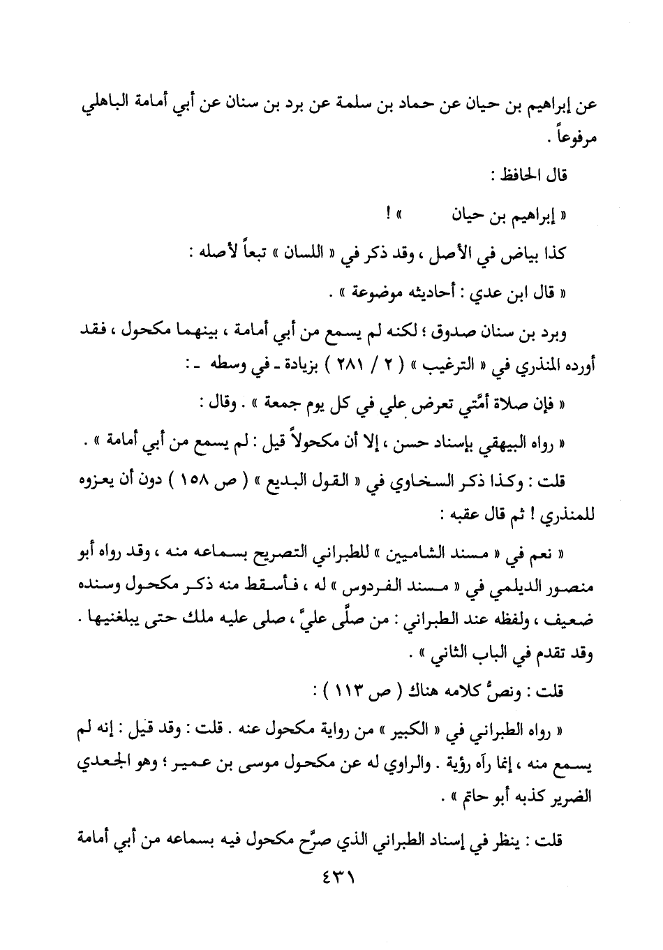 " رواه البيهقي بإسناد حسن، إلا أن مكحولا قيل: لم يسمع من أبي أمامة ".