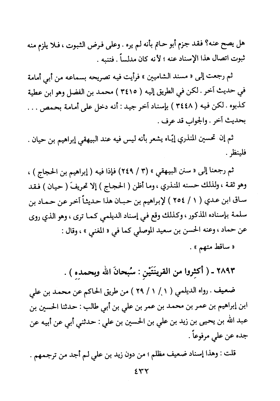 ثم رجعنا إلى " سنن البيهقي " (3/249) فإذا فيه (إبراهيم بن الحجاج) ، وهو ثقة، ولذلك حسنه المنذري، وما أظن (الحجاج) إلا تحريف (حيان) فقد ساق ابن عدي (1/254) لإبراهيم بن حبان هذا حديثا آخر عن حماد بن سلمة بإسناده المذكور، وكذلك وقع في إسناد الديلمي كما ترى، وهو الذي روى عن حماد، وعنه الحسن بن سعيد الموصلي كما في " المغني "، وقال:
