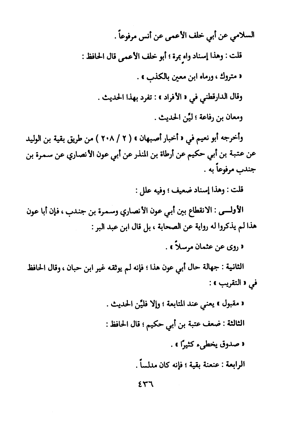 الأولى: الانقطاع بين أبي عون الأنصاري وسمرة بن جندب، فإن أبا عون هذا لم يذكروا له رواية عن الصحابة، بل قال ابن عبد البر: