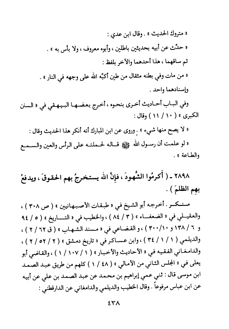أخرجه أبو الشيخ في " طبقات الأصبهانيين " (ص 308) ، والعقيلي في " الضعفاء " (3/84) ، والخطيب في " التاريخ " (5/94 و 6/138 و 10/300) ، والقضاعي في " مسند الشهاب " (ق 62/2) ، والديلمي (1/1/34) ، وابن عساكر في " تاريخ دمشق " (2/52/2) ، والدامغاني الفقيه في " الأحاديث والأخبار " (1/107/1) ، والقاضي أبو يعلى في " المجلس الثاني من الأمالي " (48/1) كلهم من طريق عبد الصمد بن موسى قال: حدثني عمي إبراهيم بن محمد عن عبد الصمد بن علي عن أبيه عن ابن عباس مرفوعا. وقال الخطيب والديلمي والدامغاني عن الدارقطني: