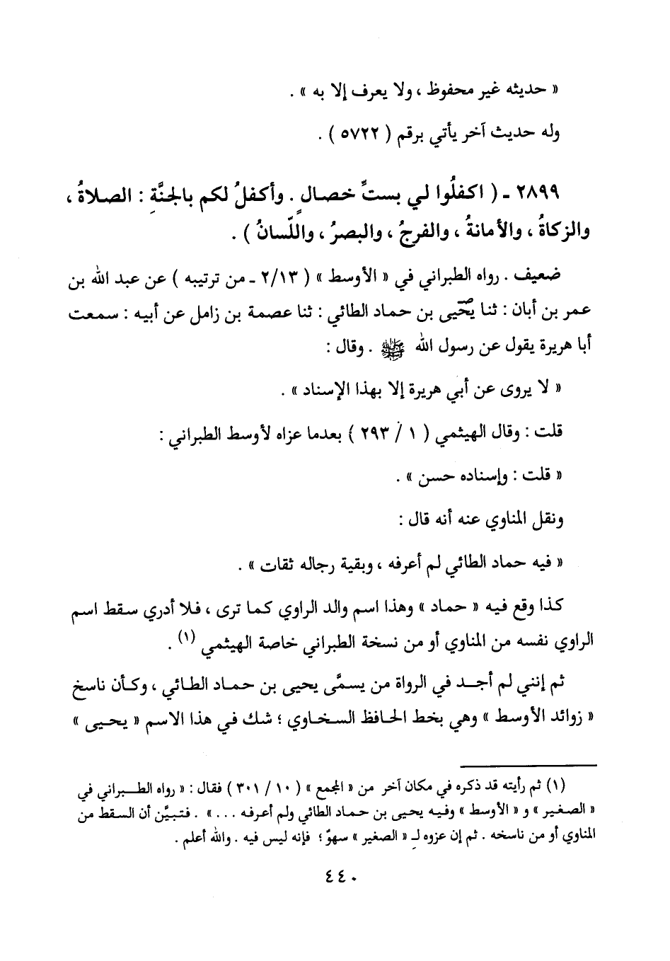 ثم إنني لم أجد في الرواة من يسمى يحيى بن حماد الطائي، وكأن ناسخ " زوائد الأوسط " وهي بخط الحافظ السخاوي؛ شك في هذا الاسم " يحيى "