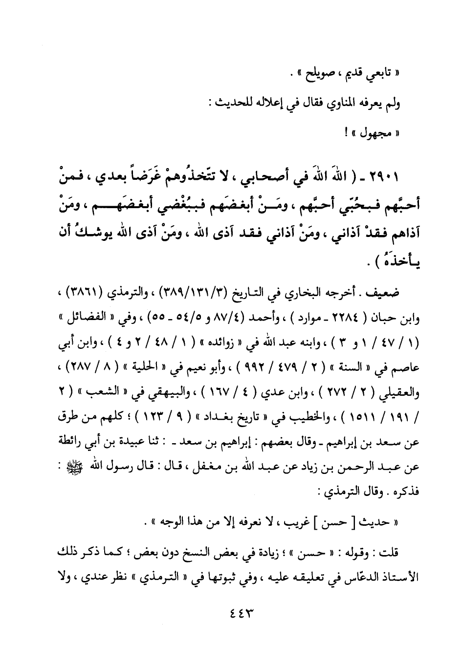 2901 - (الله الله في أصحابي، لا تتخذوهم غرضا بعدي، فمن أحبهم فبحبي أحبهم، ومن أبغضهم فبغضي أبغضهم، ومن آذاهم فقد آذاني، ومن آذاني فقد آذى الله يوشك أن يأخذه) .