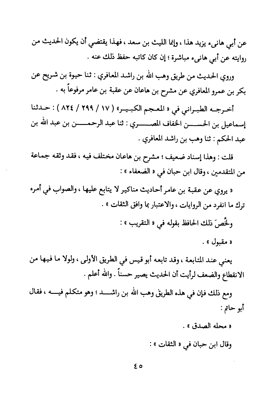 قلت: وهذا إسناد ضعيف؛ مشرح بن هاعان مختلف فيه، فقد وثقه جماعة من المتقدمين، وقال ابن حبان في " الضعفاء ":