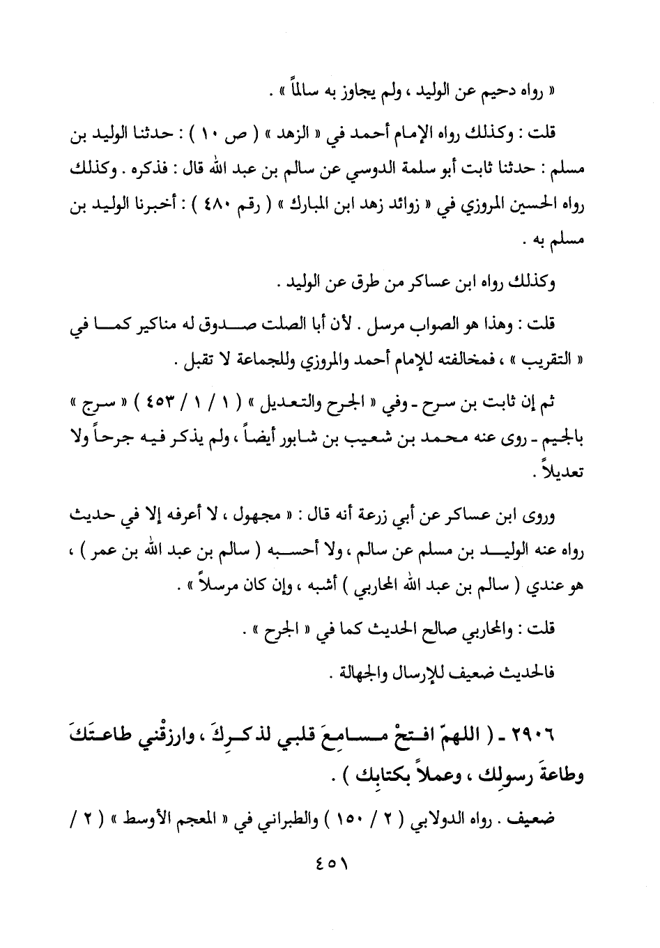قلت: وكذلك رواه الإمام أحمد في " الزهد " (ص 10) : حدثنا الوليد بن مسلم: حدثنا ثابت أبو سلمة الدوسي عن سالم بن عبد الله قال: فذكره. وكذلك رواه الحسين المروزي في " زوائد زهد ابن المبارك " (رقم 480) : أخبرنا الوليد بن مسلم به.