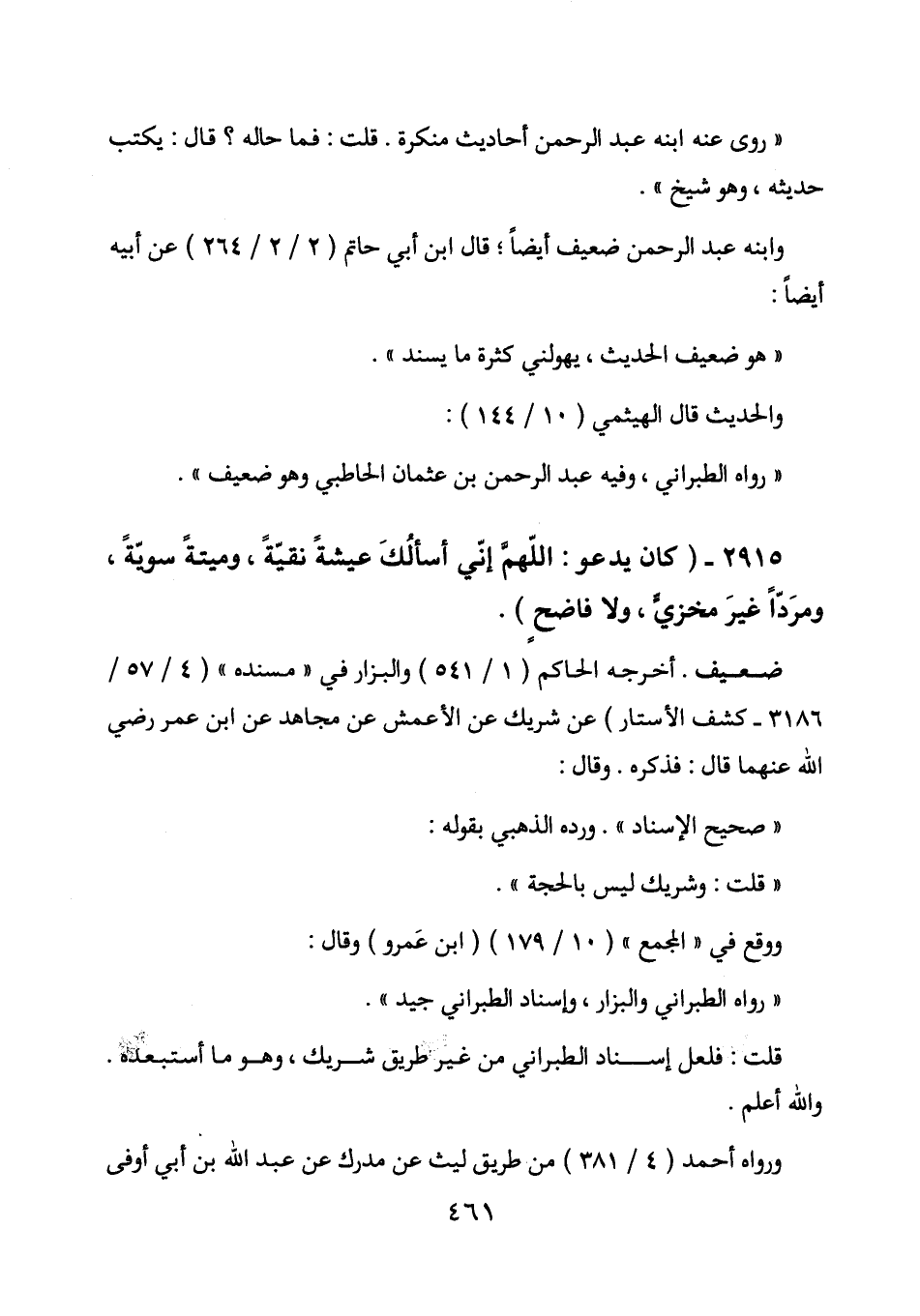 " روى عنه ابنه عبد الرحمن أحاديث منكرة. قلت: فما حاله؟ قال: يكتب حديثه، وهو شيخ ".