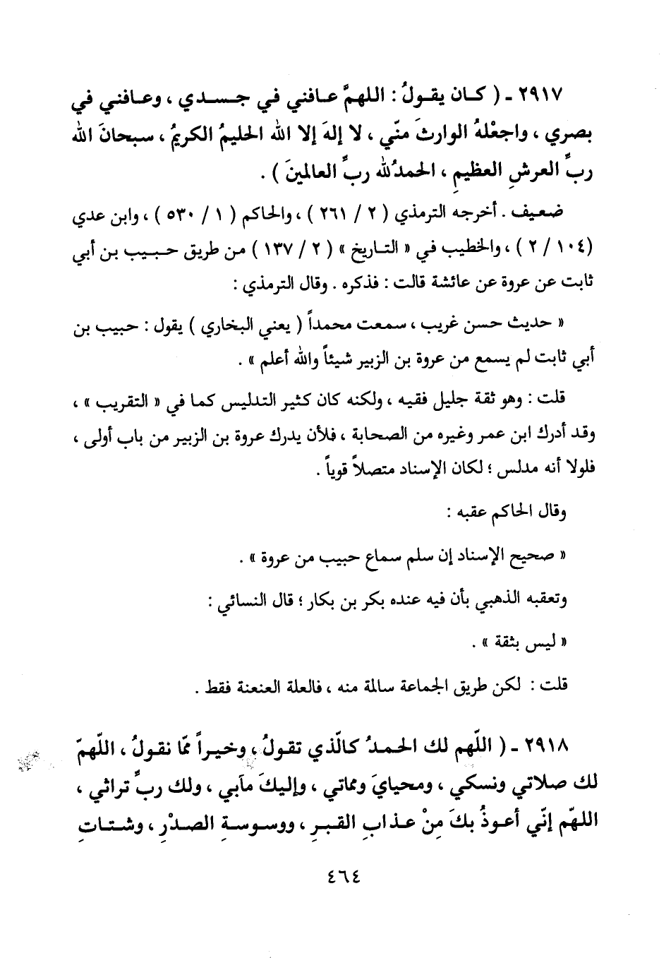 2917 - (كان يقول: اللهم عافني في جسدي وعافني في بصري واجعله الوارث مني، لا إله إلا الله الحليم الكريم، سبحان الله رب العرش العظيم، الحمد لله رب العالمين) .