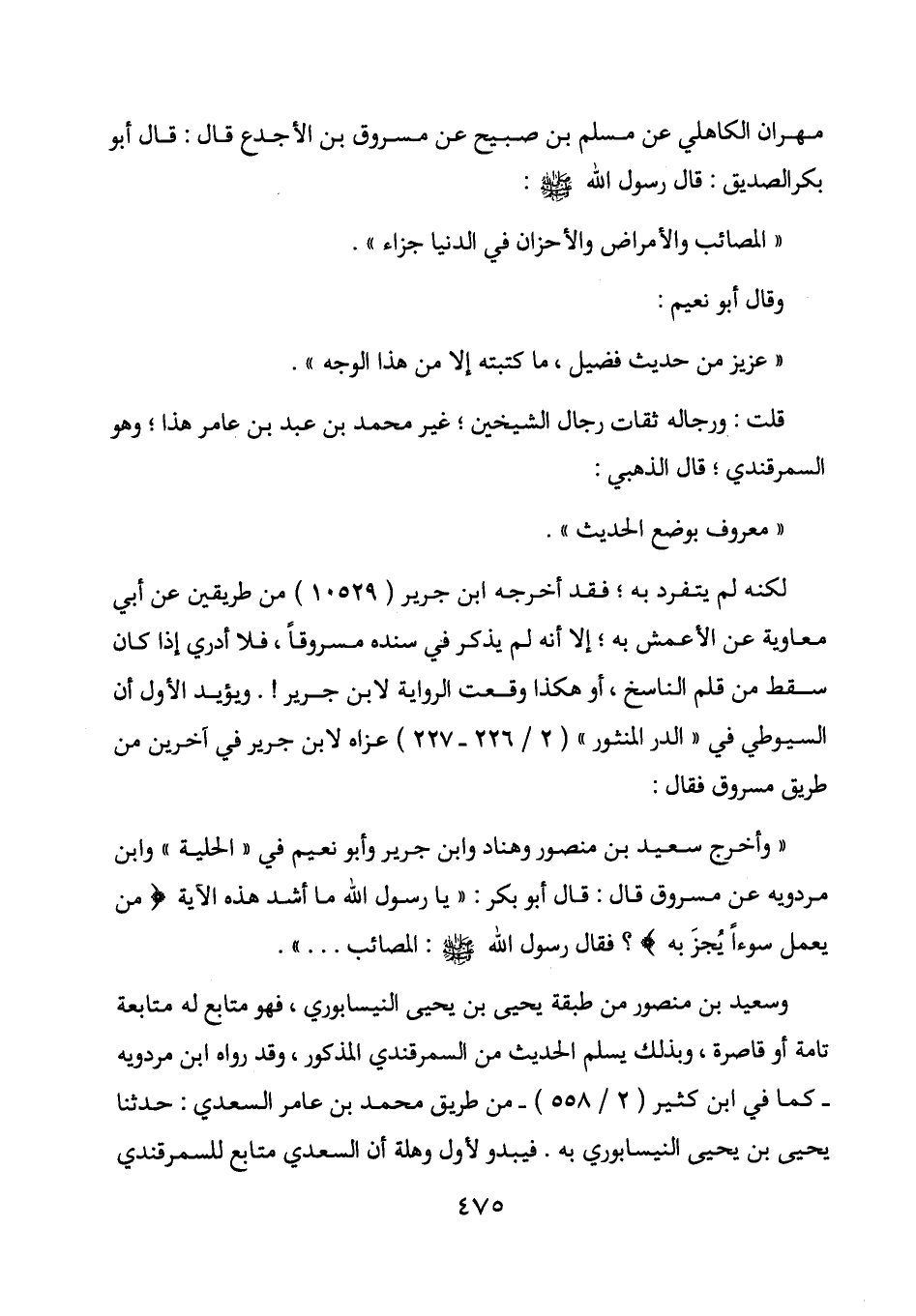 " وأخرج سعيد بن منصور وهناد وابن جرير ,ابو نعيم في " الحلية " وابن مردويه عن مسروق قال: قال أبو بكر: يا رسول الله ما أشد هذه الآية (من يعمل سوء يجزبه) ؟ فقال رسول الله صلى الله عليه وسلم: المصائب ... ".