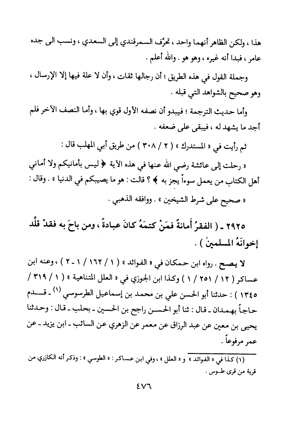 هذا، ولكن الظاهر أنهما واحد، تحرف السمرقندي إلى السعدي، ونسب الى جده عامر، فبدا أنه غيره، وهو هو. والله أعلم.