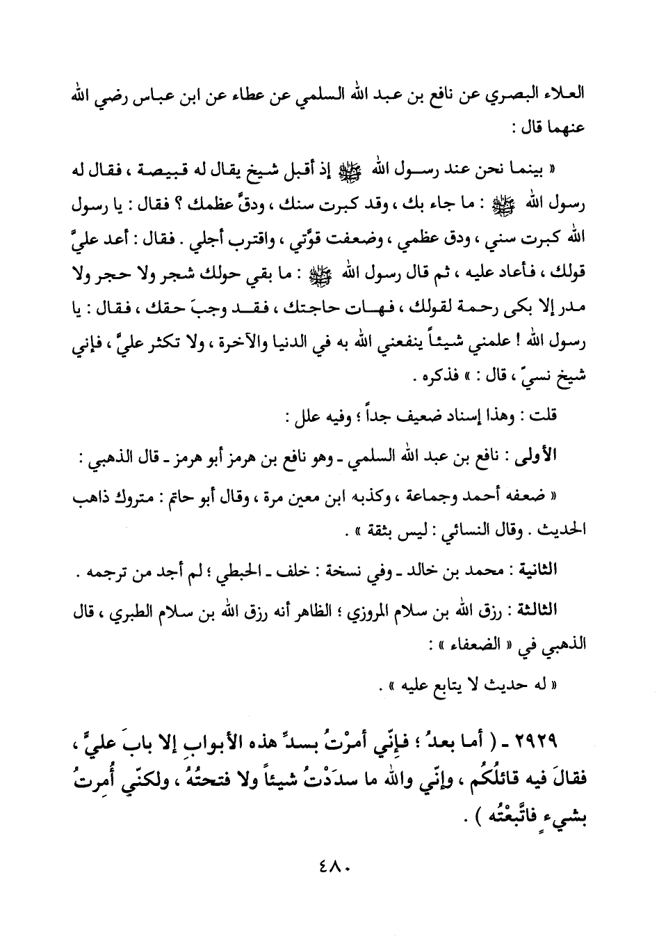 2929 - (أما بعد؛ فإني أمرت بسد هذه الأبواب إلا باب علي، فقال فيه قائلكم، وإني والله ما سددت شيئا ولا فتحته، ولكني أمرت بشيء فاتبعته) .