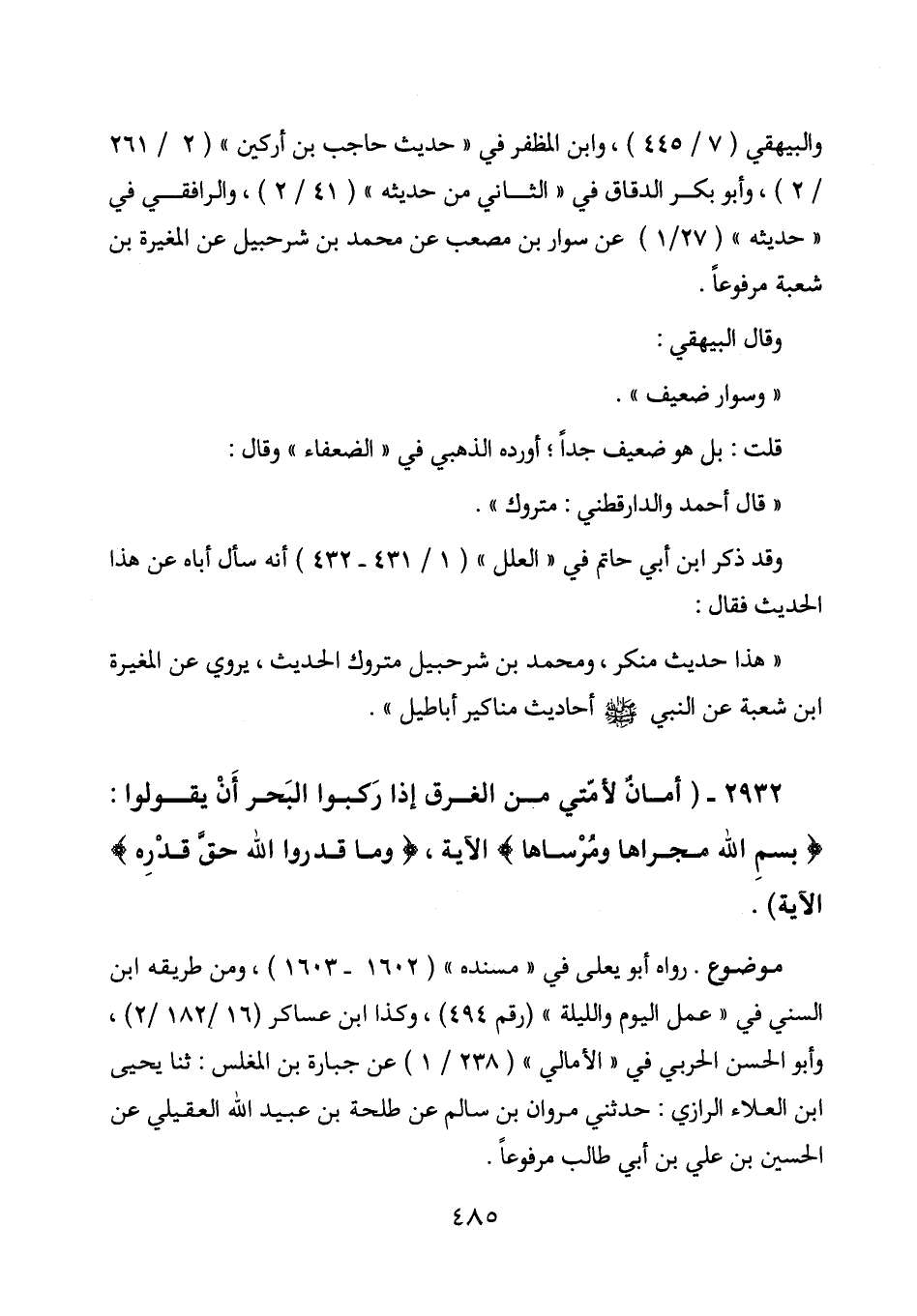 2932 - (أمان لأمتي من الغرق إذا ركبوا البحر أن يقولوا: (بسم الله مجراها ومرساها) الآية، (وما قدروا الله حق قدره) الآية) .