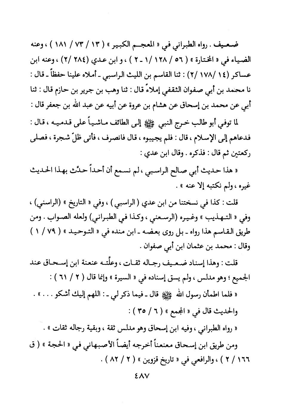 لما توفي أبو طالب خرج النبي صلى الله عليه وسلم إلى الطائف ماشيا على قدميه، قال: فدعاهم إلى الإسلام، قال: فلم يجيبوه، قال فانصرف، فأتى ظل شجرة، فصلى ركعتين ثم قال: فذكره. وقال ابن عدي:
