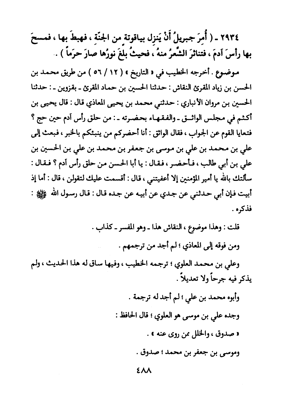 أخرجه الخطيب في " التاريخ " (12/56) من طريق محمد بن الحسن بن زياد المقرىء النقاش: حدثنا الحسين بن حماد المقرىء - بقزوين -: حدثنا الحسين بن مروان الأنباري: حدثني محمد بن يحيى المعاذي قال: قال يحيى بن أكثم في مجلس الواثق - والفقهاء بحضرته -: من حلق رأس آدم حين حج؟ فتعايا القوم عن الجواب، فقال الواثق: أنا أحضركم من ينبئكم بالخبر، فبعث إلى علي بن محمد بن علي بن موسى بن جعفر بن محمد بن علي بن الحسين بن علي بن أبي طالب، فأحضر، فقال: يا أبا الحسن من حلق رأس آدم؟ فقال: سألتك بالله يا أمير المؤمنين إلا أعفيتني، قال: أقسمت عليك لتقولن، قال: أما إذ أبيت فإن أبي حدثني عن جدي عن أبيه عن جده قال: قال رسول الله صلى الله عليه وسلم: فذكره.