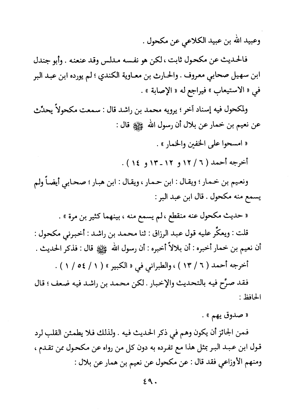 فمن الجائز أن يكون وهم في ذكر الحديث فيه. ولذلك فلا يطمئن القلب لرد قول ابن عبد البر بمثل هذا مع تفرده به دون كل من رواه عن مكحول ممن تقدم، ومنهم الأوزاعي فقد قال: عن مكحول عن نعيم بن همار عن بلال: