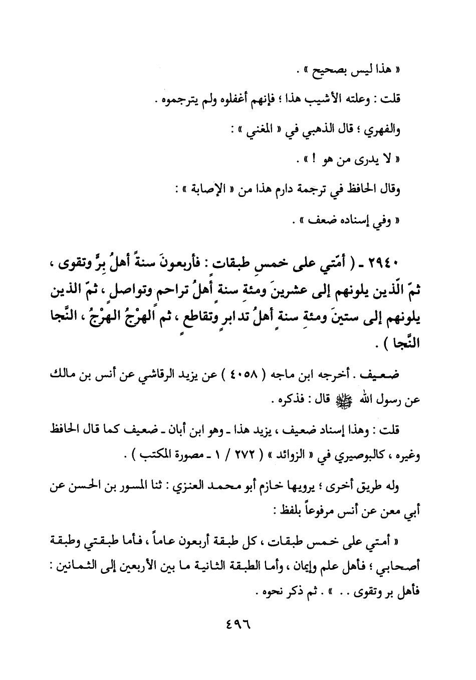 2940 - (أمتي على خمس طبقات: فأربعون سنة أهل بر وتقوى، ثم الذين يلونهم إلى عشرين ومئة سنة أهل تراحم وتواصل، ثم الذين يلونهم إلى ستين ومئة سنة أهل تدابر وتقاطع، ثم الهرج الهرج، النجا النجا) .