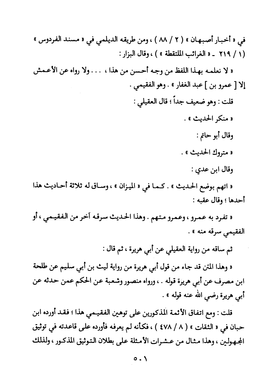 قلت: ومع اتفاق الأئمة المذكورين على توهين الفقيمي هذا؛ فقد أورده ابن حبان في " الثقات " (8/478) ، فكأنه لم يعرفه فأورده على قاعدته في توثيق المجهولين، وهذا مثال من عشرات الأمثلة على بطلان التوثيق المذكور، ولذلك