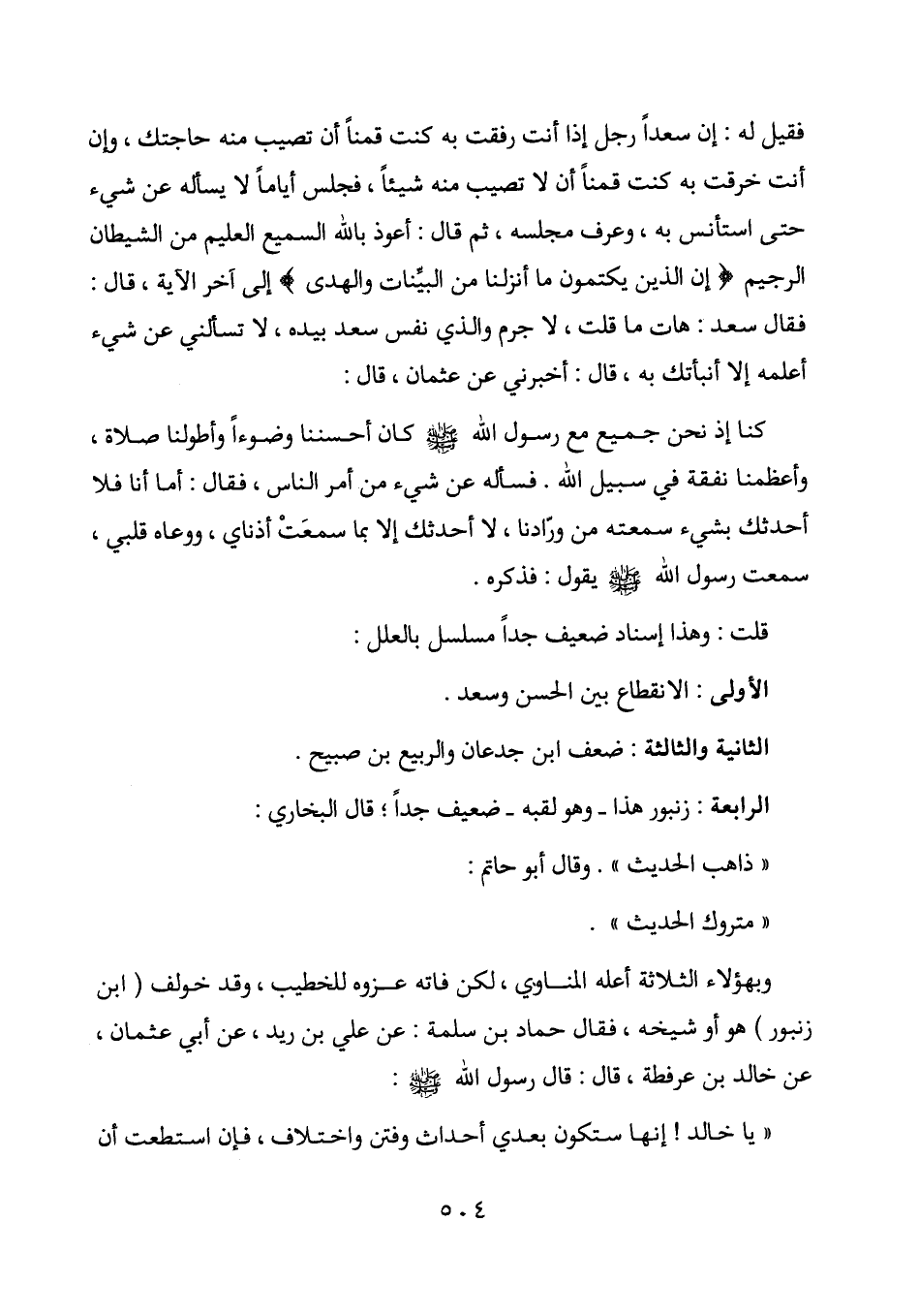 وبهؤلاء الثلاثة أعله المناوي، لكن فاته عزوه للخطيب، وقد خولف (ابن زنبور) هو أو شيخه، فقال حماد بن سلمة: عن علي بن ريد، عن أبي عثمان، عن خالد بن عرفطة، قال: قال رسول الله صلى الله عليه وسلم:
