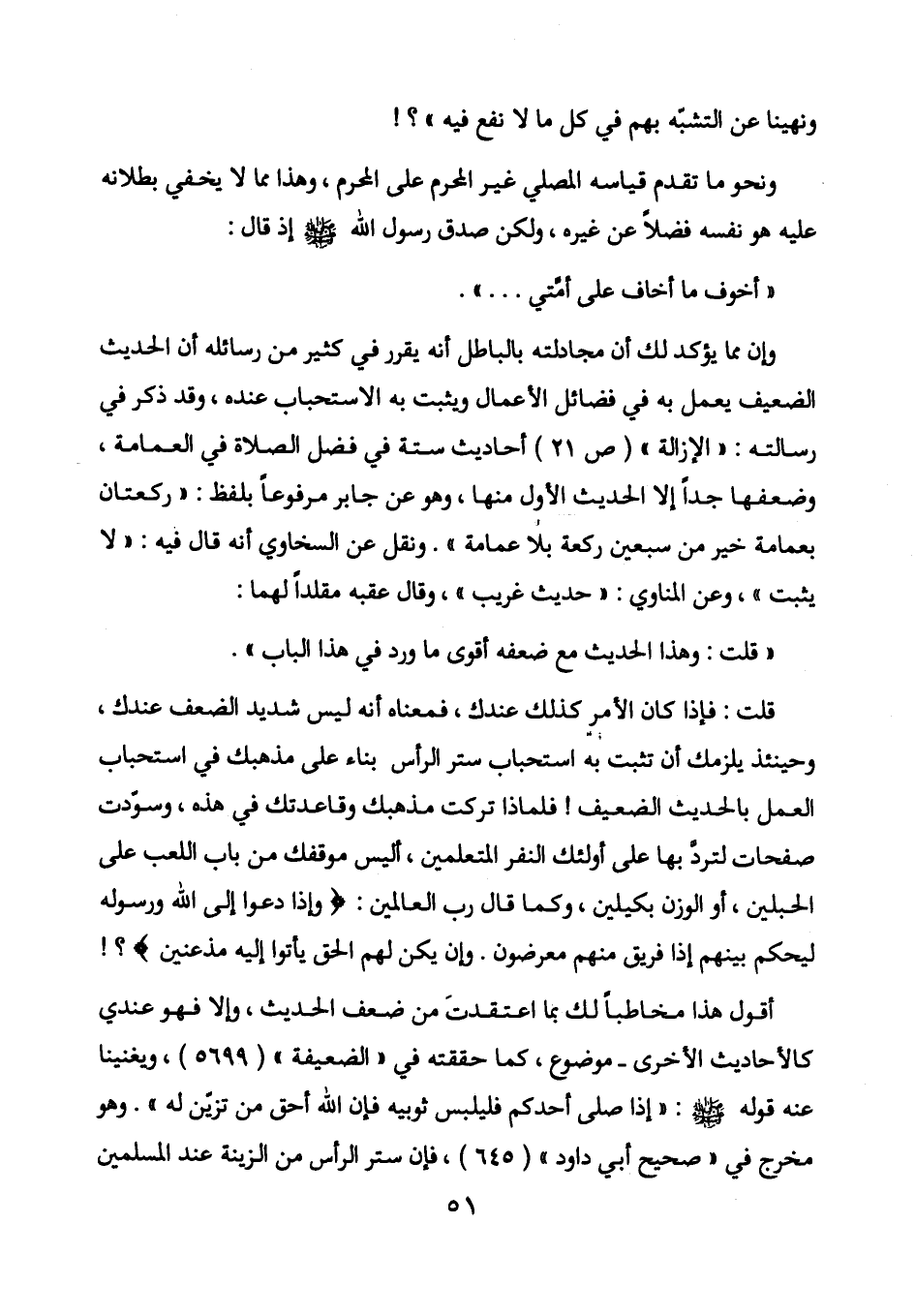 قلت: فإذا كان الأمر كذلك عندك، فمعناه أنه ليس شديد الضعف عندك، وحينئذ يلزمك أن تثبت به استحباب ستر الرأس بناء على مذهبك في استحباب العمل بالحديث الضعيف! فلماذا تركت مذهبك وقاعدتك في هذه، وسودت صفحات لترد بها على أولئك النفر المتعلمين، أليس موقفك من باب اللعب على الحبلين، أو الوزن بكيلين، وكما قال رب العالمين: (وإذا دعوا إلى الله ورسوله ليحكم بينهم إذا فريق منهم معرضون. وإن يكن لهم الحق يأتوا إليه مذعنين) ؟!