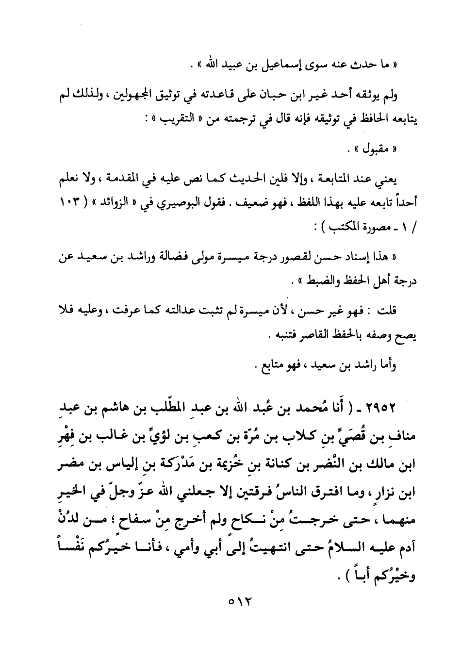 2952 - (أنا محمد بن عبد الله بن عبد المطلب بن هاشم بن عبد مناف بن قصي بن كلاب بن مرة بن كعب بن لؤي بن غالب بن فهر بن مالك بن النضر بن كنانة بن خزيمة بن مدركة بن إلياس بن مضر بن نزار، وما افترق الناس فرقتين إلا جعلني الله عز وجل في الخير منهما، حتى خرجت من نكاح ولم أخرج من سفاح؛ من لدن آدم عليه السلام حتى انتهيت إلى أبي وأمي، فأنا خيركم نفسا وخيركم أبا) .