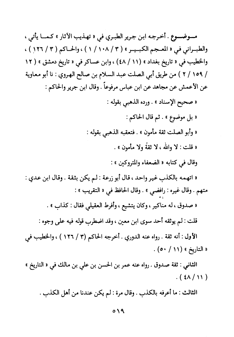 أخرجه ابن جرير الطبري في " تهذيب الآثار " كما يأتي، والطبراني في " المعجم الكبير " (3/108/1) ، والحاكم (3/126) ، والخطيب في " تاريخ بغداد " (11/48) ، وابن عساكر في " تاريخ دمشق " (12/159/2) من طريق أبي الصلت عبد السلام بن صالح العروي: أخبرنا أبو معاوية عن الأعمش عن مجاهد عن ابن عباس مرفوعا. وقال ابن جرير والحاكم: