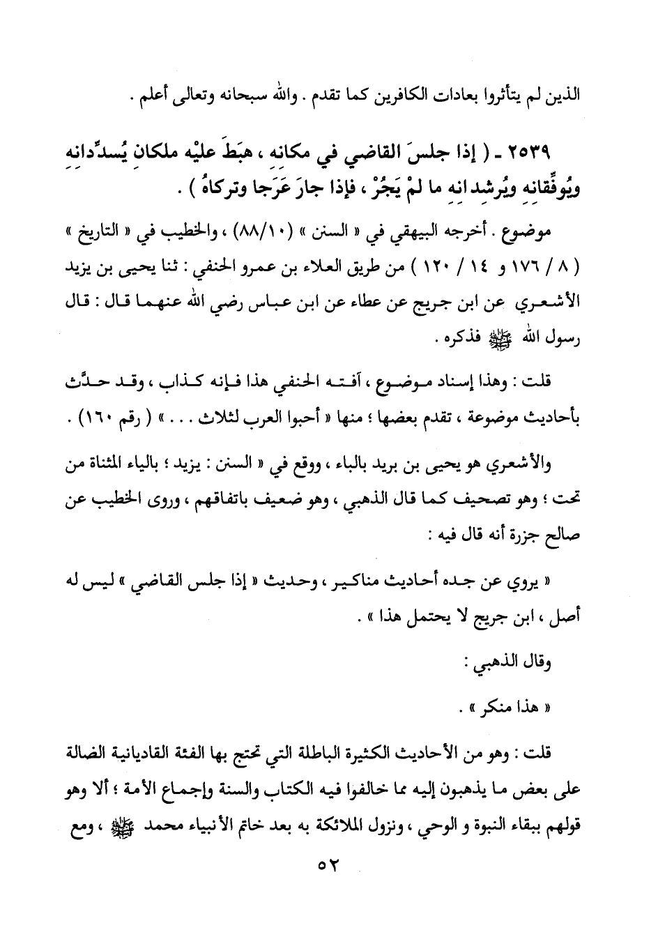 2539 - (إذا جلس القاضي في مكانه، هبط عليه ملكان يسددانه ويوقفانه ويرشدانه ما لم يجر، فإذا جار عرجا وتركاه) .