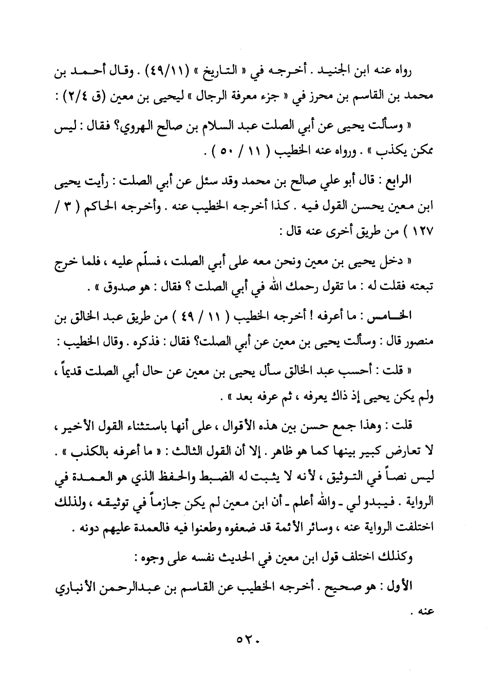 " وسألت يحيى عن أبي الصلت عبد السلام بن صالح الهروي؟ فقال: ليس ممن يكذب ". ورواه عنه الخطيب (11/50) .