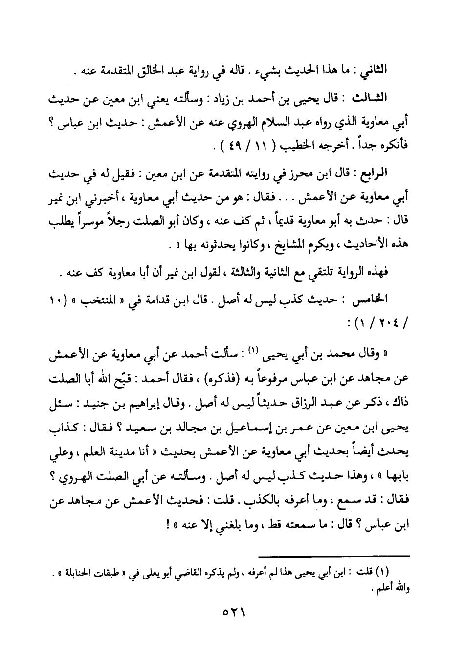 الثالث: قال يحيى بن أحمد بن زياد: وسألته يعني ابن معين عن حديث أبي معاوية الذي رواه عبد السلام الهروي عنه عن الأعمش: حديث ابن عباس؟ فأنكره جدا. أخرجه الخطيب (11/49) .