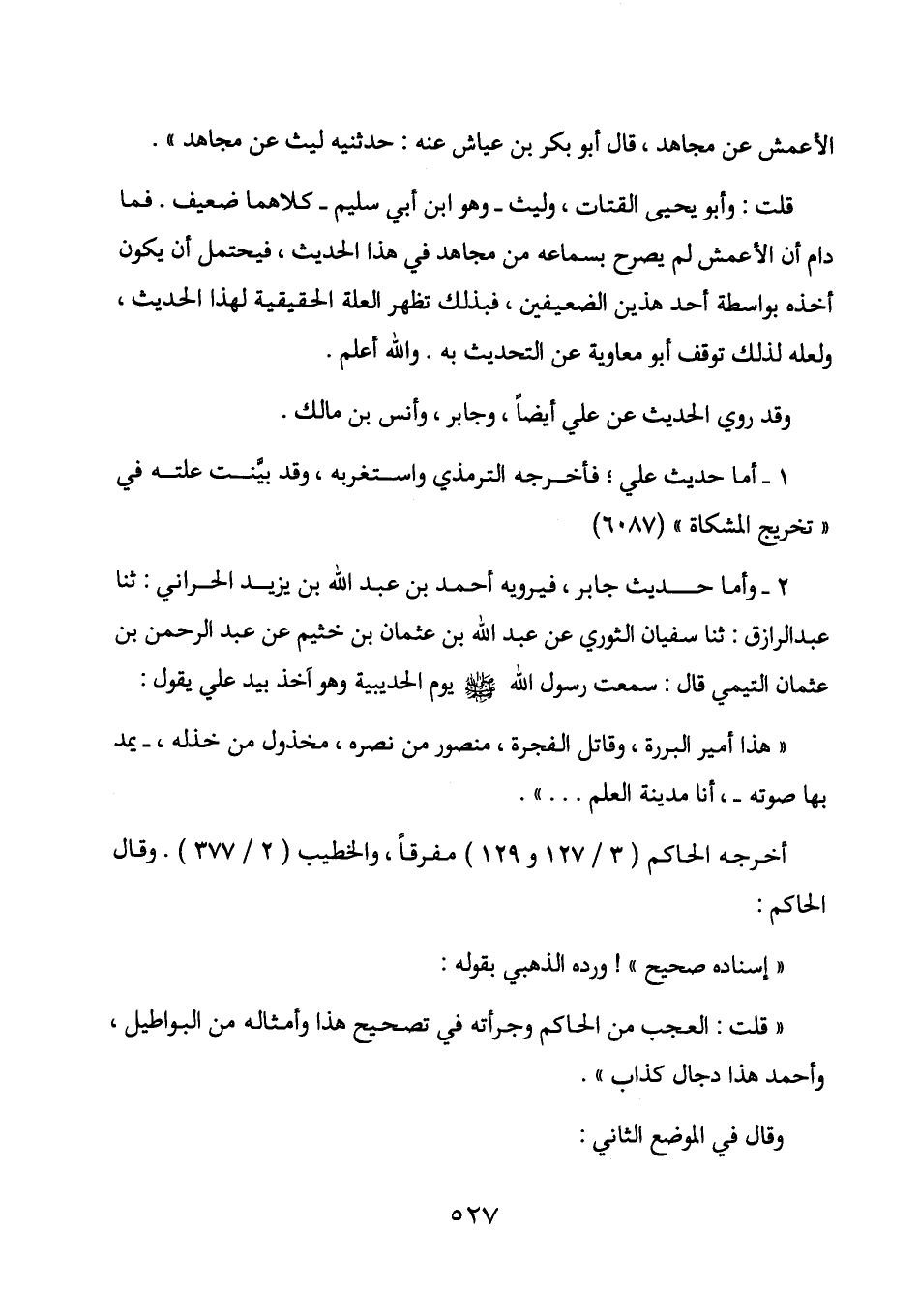 2- وأما حديث جابر، فيرويه أحمد بن عبد الله بن يزيد الحراني: حدثنا عبد الرزاق: حدثنا سفيان الثوري عن عبد الله بن عثمان بن خثيم عن عبد الرحمن بن عثمان التيمي قال: سمعت رسول الله صلى الله عليه وسلم يوم الحديبية وهو آخذ بيد علي يقول: