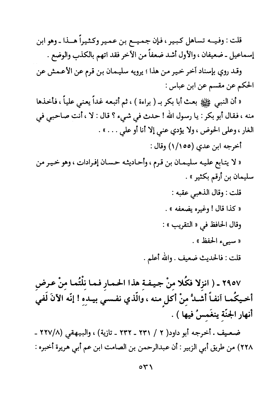 2957 - (انزلا فكلا من جيفة هذا الحمار فما نلتما من عرض أخيكما آنفا أشد من أكل منه، والذي نفسي بيده! إنه الآن لفي أنهار الجنة ينغمس فيها) .