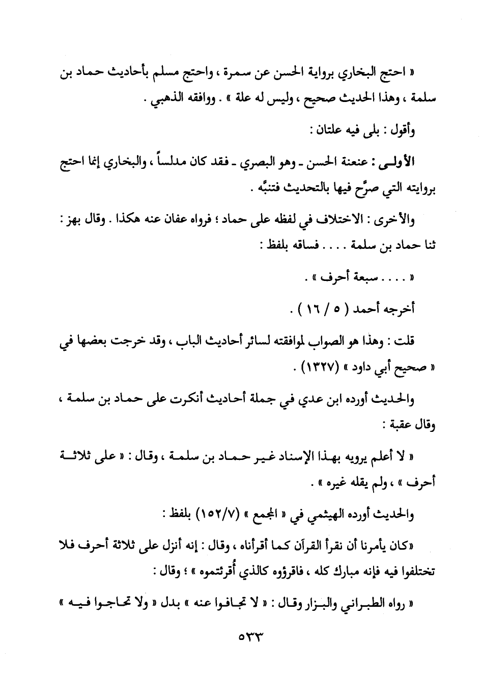 " لا أعلم يرويه بهذا الإسناد غير حماد بن سلمة، وقال: " على ثلاثة أحرف "، ولم يقله غيره ".