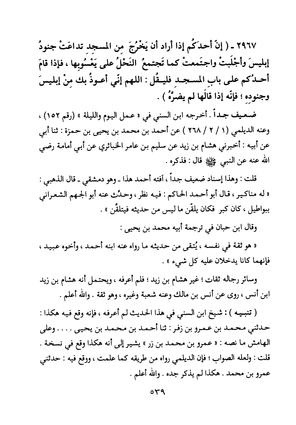 2967 - (إن أحدكم إذا أراد أن يخرج من المسجد تداعت جنود إبليس وأجلبت واجتمعت كما تجتمع النحل على يعسوبها، فإذا قام أحدكم على باب المسجد فليقل: اللهم إني أعوذ بك من إبليس وجنوده؛ فإنه إذا قالها لم يضره) .
