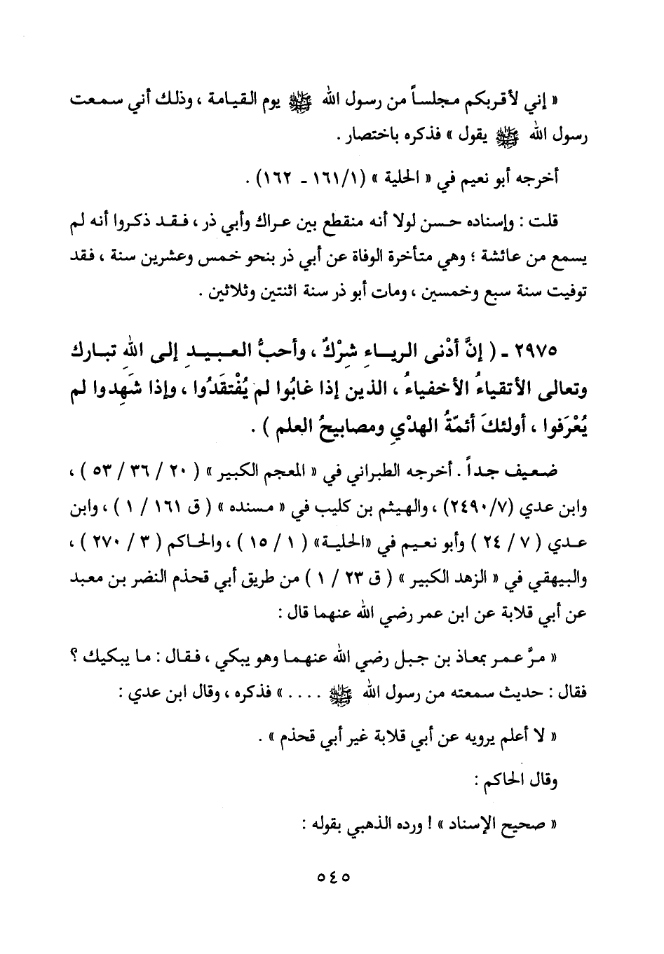 2975 - (إن أدنى الرياء شرك، وأحب العبيد إلى الله تبارك وتعالى الأتقياء الأخفياء، الذين إذا غابوا لم يفتقدوا، وإذا شهدوا لم يعرفوا، أولئك أئمة الهدي ومصابيح العلم) .