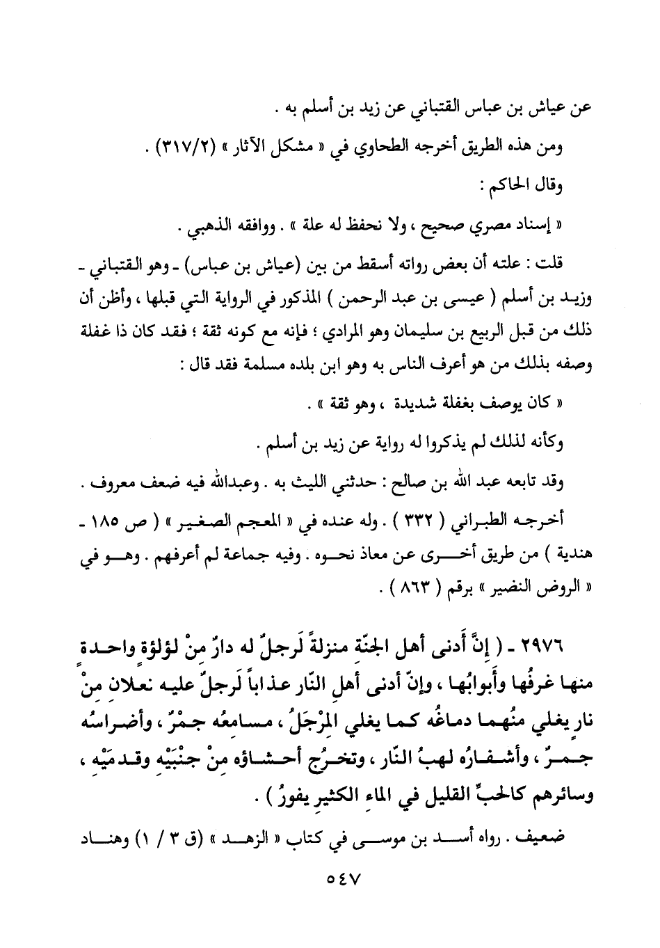 2976 - (إن أدنى أهل الجنة منزلة لرجل له دار من لؤلؤة واحدة منها غرفها وأبوابها، وإن أدنى أهل النار عذابا لرجل عليه نعلان من نار يغلي منهما دماغه كما يغلي المرجل، مسامعه جمر، وأضراسه جمر، وأشفاره لهب النار، وتخرج أحشاؤه من جنبيه وقدميه، وسائرهم كالحب القليل في الماء الكثير يفور) .