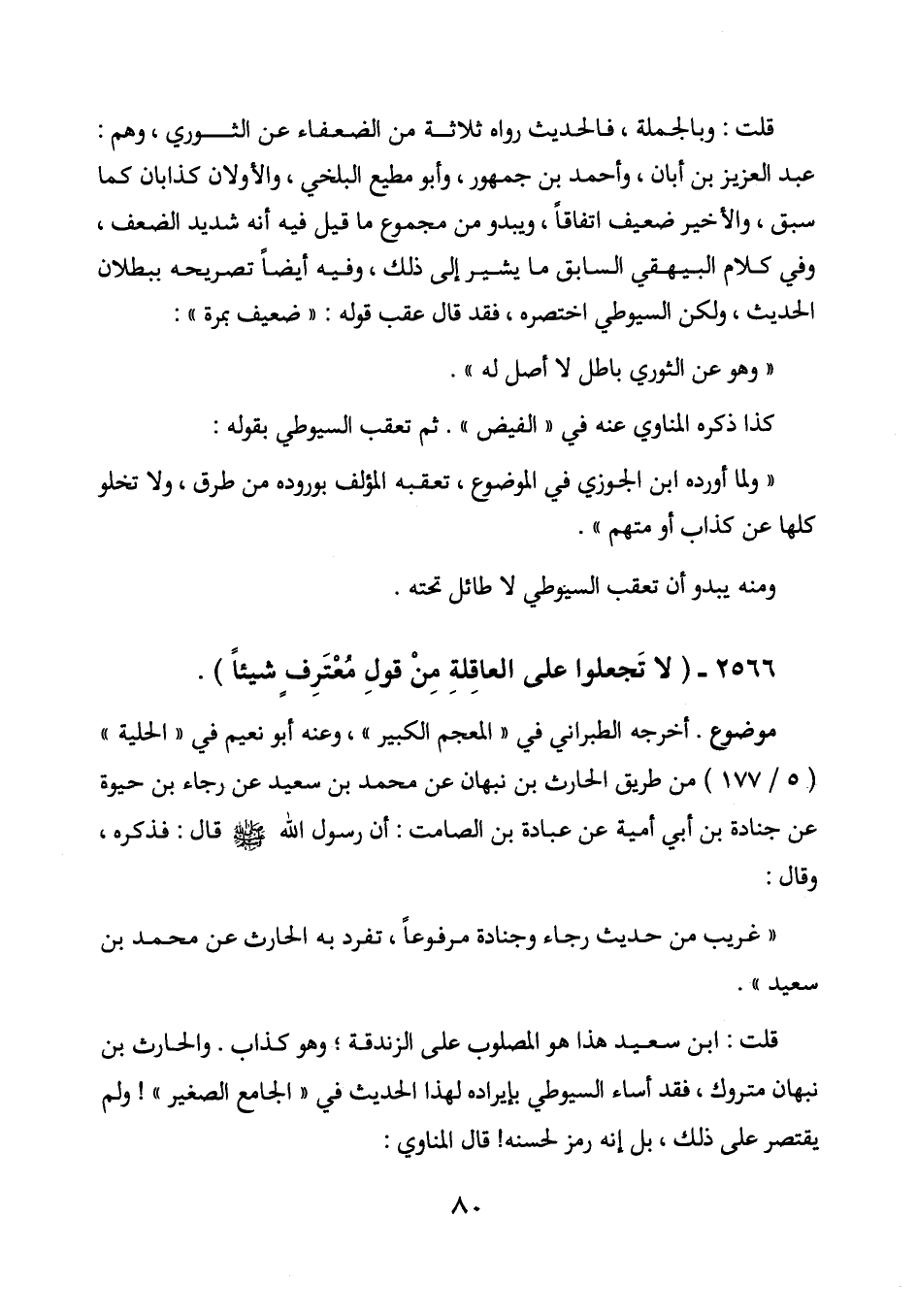قلت: وبالجملة، فالحديث رواه ثلاثة من الضعفاء عن الثوري، وهم: عبد العزيز بن أبان، وأحمد بن جمهور، وأبو مطيع البلخي، والأولان كذابان كما سبق، والأخير ضعف اتفاقا، ويبدو من مجموع ما قيل فيه أنه شديد الضعف، وفي كلام البيهقي السابق ما يشير إلى ذلك، وفيه أيضا تصريحه ببطلان الحديث، ولكن السيوطي اختصره، فقد قال عقب قوله: " ضعيف بمرة ":