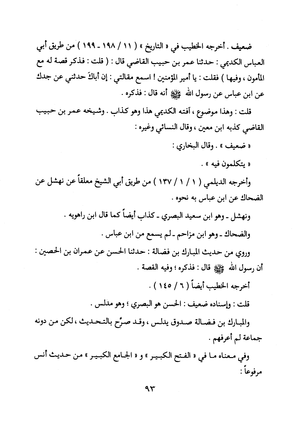 أخرجه الخطيب في " التاريخ " (11/198 - 199) من طريق أبي العباس الكديمي: حدثنا عمر بن حبيب القاضي قال: (قلت: فذكر قصة له مع المأمون، وفيها) فقلت: يا أمير المؤمنين! اسمع مقالتي: إن أباك حدثني عن جدك عن ابن عباس عن رسول الله صلى الله عليه وسلم أنه قال: فذكره.