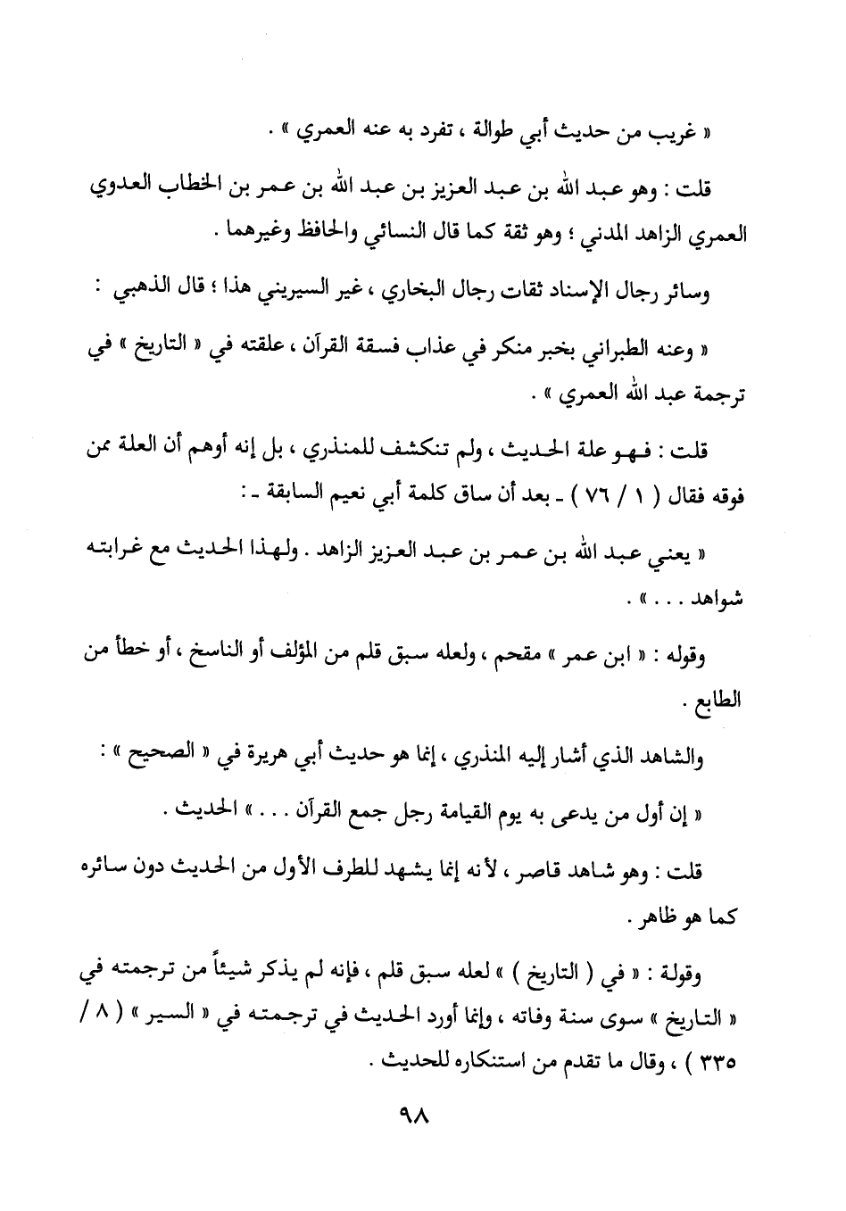 " يعني عبد الله بن عمر بن عبد العزيز الزاهد. ولهذا الحديث مع غرابته شواهد ... ".