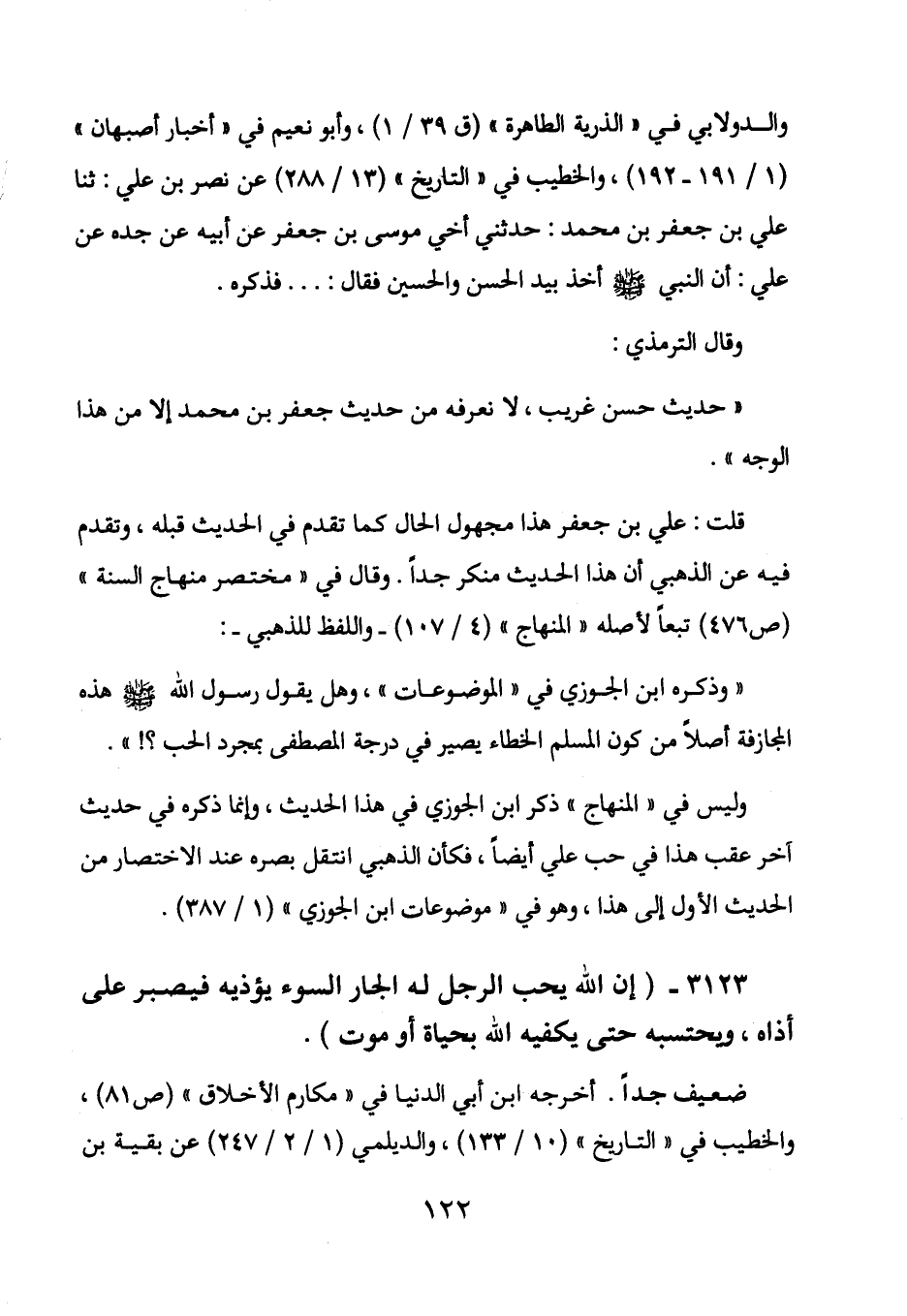 "وذكره ابن الجوزي في "الموضوعات"، وهل يقول رسول الله - صلى الله عليه وسلم - هذه المجازفة أصلاً من كون المسلم الخطاء يصير في درجة المصطفى بمجرد الحب؟! ".