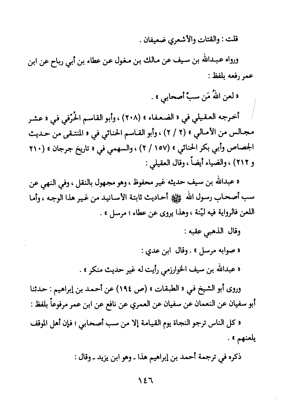 "عبد الله بن سيف حديثه غير محفوظ، وهو مجهول بالنقل، وفي النهي عن سب أصحاب رسول الله - صلى الله عليه وسلم - أحاديث ثابتة الأسانيد من غير هذا الوجه، وأما اللعن فالراوية فيه لينة، وهذا يروى عن عطاء؛ مرسل".